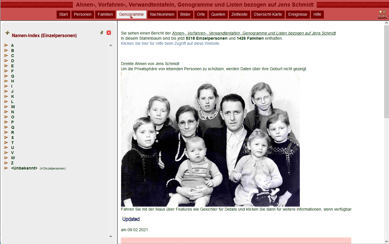 Beim Besuch dieser Seite erhält jeder " Besucherrecht " und kann eine begrenzte Zeit diesen Stammbaum erforschen. Aus Datenschutzgründen werden lebende Personen ohne Geburtsdaten und Personen unter 100 Jahren auch ohne Bilder gezeigt.
